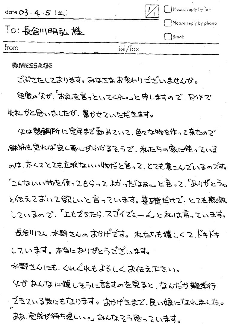 大阪府泉大津市Sさん 2003年12月竣工 私たちが、インターネットのHPを見てはせがわさんを始めて知りました。その頃はその他の建築家のHPなども、よく見ていましたが敷居の高さや身近な生活感のなさに今ひとつ同調できないのが現状でした。 そういった中で、生活感があり親近感を持ち合わせた気軽的なHPを見てうかがうことを決めました。 設計の段階に入ってからは週一度位のペースで直接会い打ち合わせを行ない持ち帰りメールで意見や修正案等をだし、又打ち合わせというやり方で設計を進めていきましたので共働きの私たちにもあまり負担がかからず、時間があるときに二人で話し合いメールを使い意見をみてもらう事で効率的にできたと思います。 建築に入ってからは、家の部分々に対してのこだわりをもつ、造り方をしている事をあらためて感じました。 家を建てるのは一生に一度か二度です。苦労もありましたけど、色々と面白かった家造りでした。 |