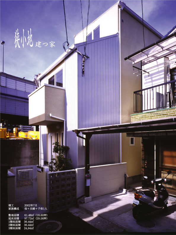 エーエーワークスでは、初期の狭小住宅です。プチ2世帯住宅で内部は計画されています。パッと見たら小さく見える家も内部はすごく広く見えます。木造3階建て在来工法です。敷地面積61.48m2、延床面積97.72m2(画像をクリックして下さい) |