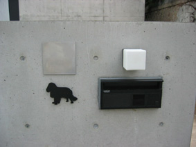表札の部分に、クライアントさんのご希望で、犬のシルエットの飾りをいれました。かわいいでしょう?(左上の四角いステンレスのプレートが表札です、お名前は消させていただいています) |