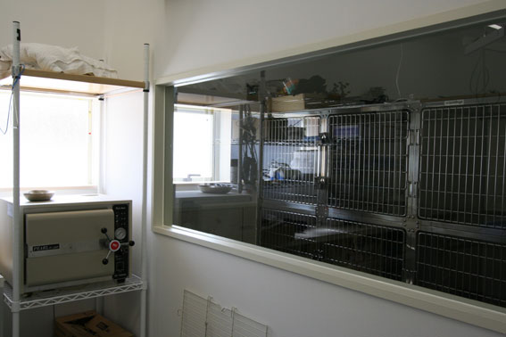 ![]() 入院室です。院長先生の要望でどこからでも見る事の出来る、入院室にして欲しいと言う事でガラス張りにしました。 |