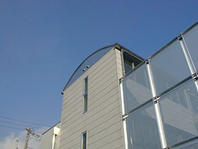 外壁仕上 ラムダサイディング アルミスパンドレル ガルバリウム鋼板の併用です。格子状のところは鉄骨とアルミパンチングメタルです。 |