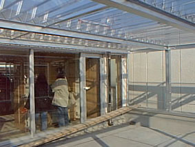 上の写真は見上げです。下の写真は3階テラスです。透明の屋根をかけてますので、雨が降っても洗濯物が濡れない、屋根があるのに明るいなどのメリットがあります。 |