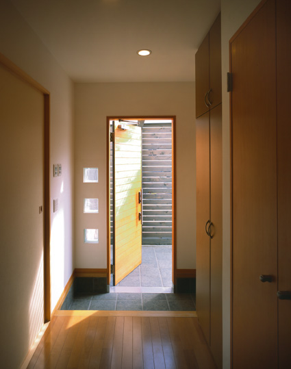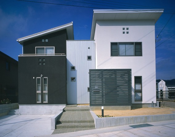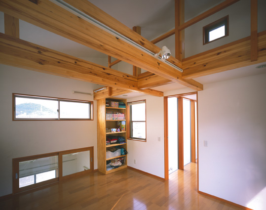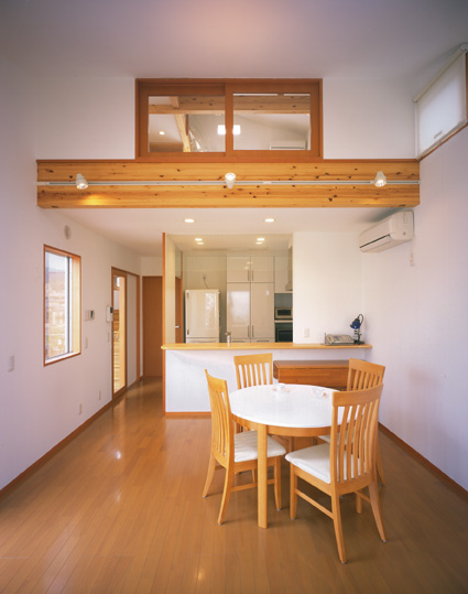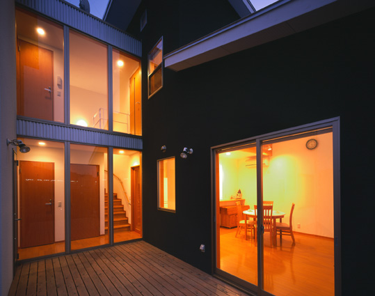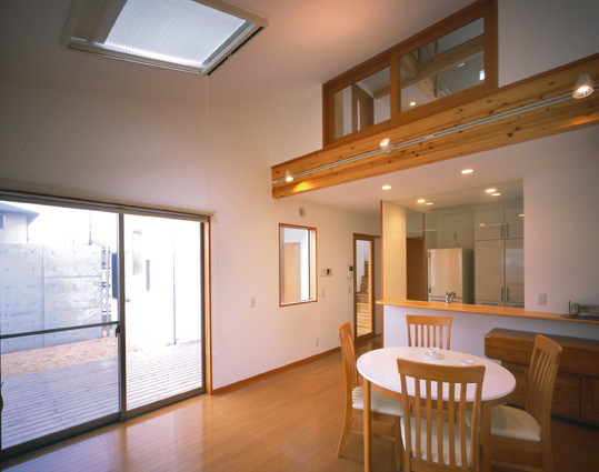 北向き、ウッドデッキのある家 H邸(兵庫県 相生市) 施工 井上工務店 2005年3月竣工 木造 2階建て 撮影 平井美行 道路から見た、ファサードです。 北側の庭とウッドデッキです。 ファサードです!! リビングダイニングからキッチンをみたところ。 リビングダイニングから、中庭のウッドデッキが見えます。 玄関ホールです。 子供室です。ロフトで楽しく生活しています。 中庭のウッドデッキからの夜景です。