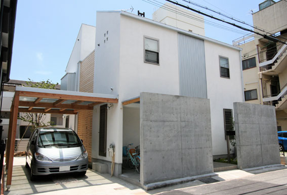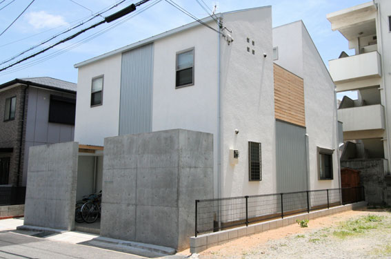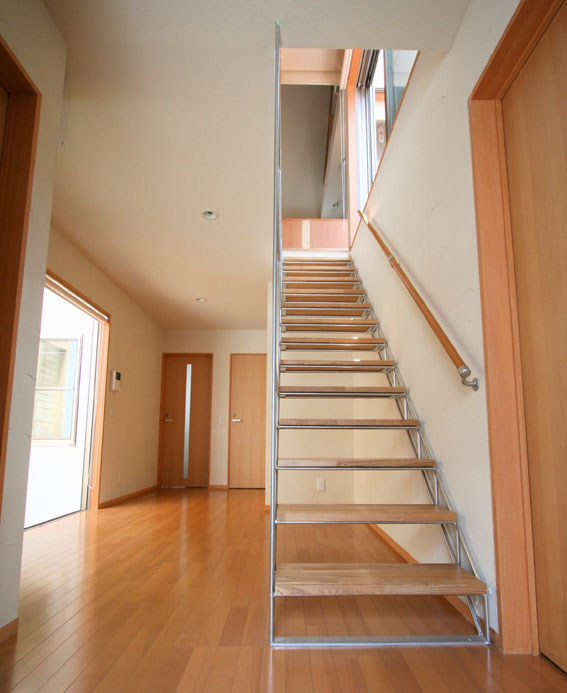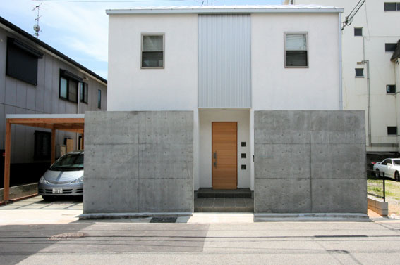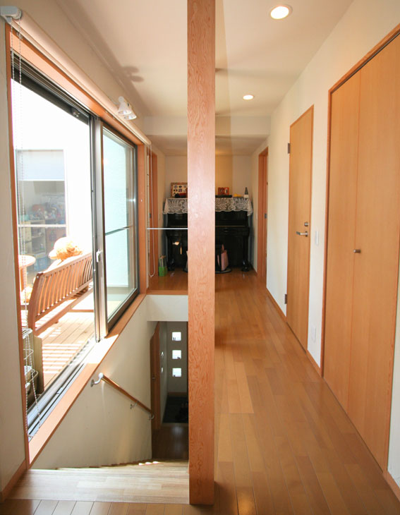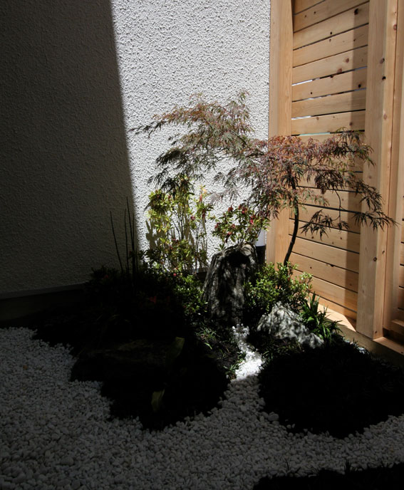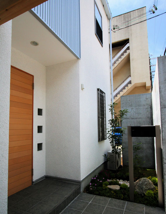 外観です、四面楚歌?の土地と名付けた四周全部の景観が悪いこの敷地にどのような家を建てるのかとても悩みました。 私達の出した回答は、建物を南北2つに分け、2つの建物の間に、1階の中庭、2階の中庭を配置し、建物の内側で開放感を得られ、光を取り入れるプランニングにしました。 外観に使用した材料は、白い壁、ガルバリウム鋼板、コンクリート打放し、自然の木を利用し、ナチュラルシンプルモダンなデザインを心がけました。 ポーチから玄関に入る所です。クライアントさんが和風っぽいデザインのガーデニングをされていました。今回ガーデニングに関しては、はせがわ事務所はタッチしていません。 玄関を入って、1階の小さなリビングのような廊下と、2階に上がる階段です。この1階の小さなリビングは普段、ソファとテレビが置かれていて、お子様やご主人の遊びスペースに使われています。 1階の小さなリビング廊下から見た、1階の中庭です。ここもテーマは「和」だそうです。 2階の階段室、廊下です。奥にはピアノが置かれています。 階段室、廊下の反対側のアングルですね。右は2階の中庭です。