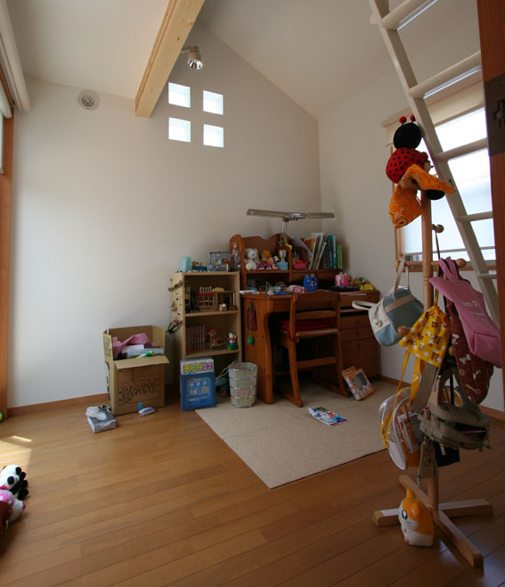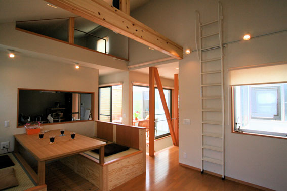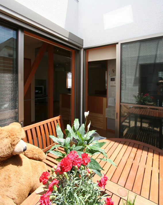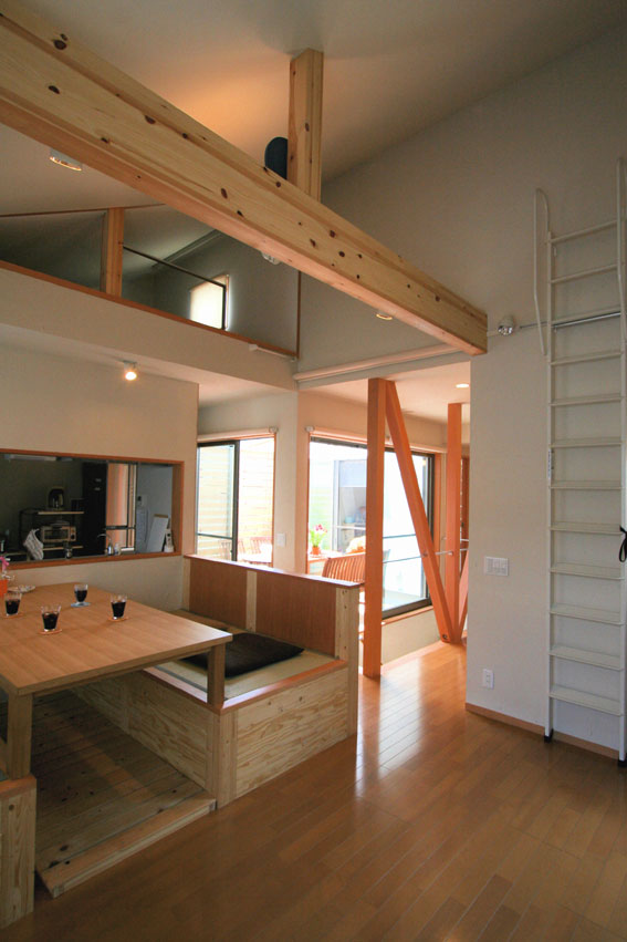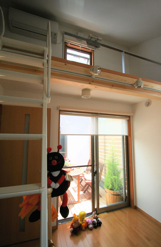 2階の中庭です。バーベキューしたい!!この中庭から、建物全体に光を取り入れています。 リビングから2階の中庭を見た所です。作り付けダイニングは寝そべったり、ゴロゴロできますので、家族の団らんの中心的存在になっています。 同じアングルの横使いの画像です。テーブルは特注で製作しました。 お子さんの部屋です。散らかり方がナチュラルなのであえて、掲載しました(笑) 子供部屋のロフトです。しっかりロフトで寝ているそうです。夏はどうなのかな?