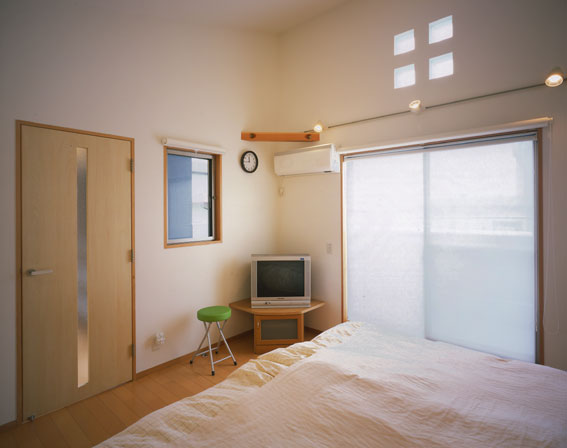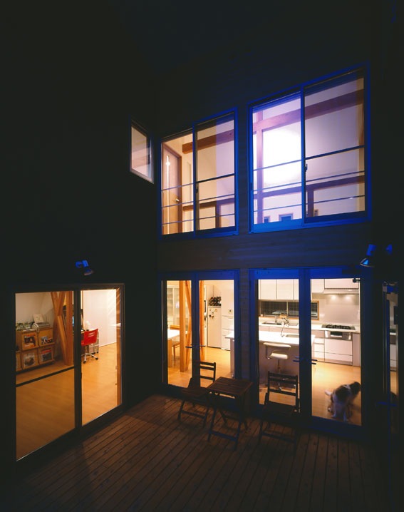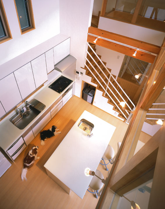 玄関から、グルーミングルーム(左)、台所(右)を見たところです。リードフックも凝ってますね!! ご夫婦、ご自慢のグルーミングルームです。4帖ありますので、私の家のお風呂よりはるかに大きいリッチな空間になっています。わんちゃん達も気持ちよく洗ってもらって、さぞかし幸せでしょうね!! 2階吹き抜けです。キッチンの上が吹抜けと言う思い切ったプランニングにしました。 主寝室です。いつものガラスブロックがやわらかく光を取り入れます。 中庭の夜景です、ちょっと街灯の光が反射してしまいしたね。