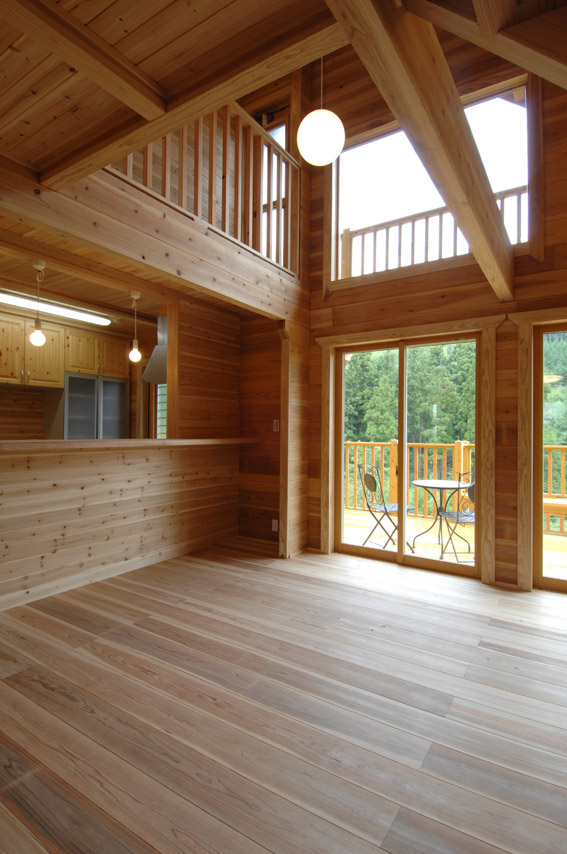 2階からリビングを見た所です。吹抜けが1階と2階の空間をつなげ、明るく豊かな空間を演出しています。 |