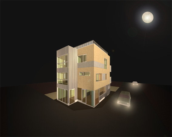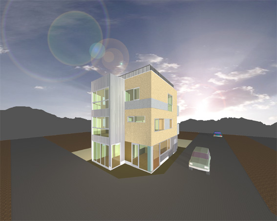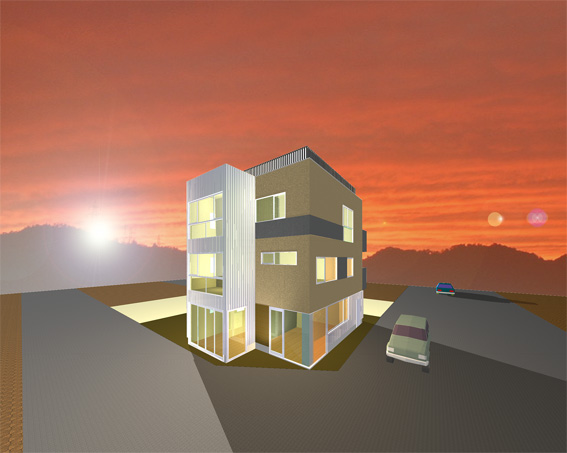 外観です。 正面からです。 お店の内部です。 完成予想CGです。まずはお昼間バージョン。 次に、日の出バージョン。 次に、夕焼けバージョン。なんで、朝日の出る位置と近いねん!! 夜バージョン。これも月の位置がおかしいぞ!!
